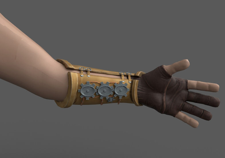 Because the playable character was a gnome, I tried to give the hand a more stout proportion, particularly shorter and stubby fingers. The brief also called for more of a steampunk approach, hence the gears and pipes on the gauntlet.